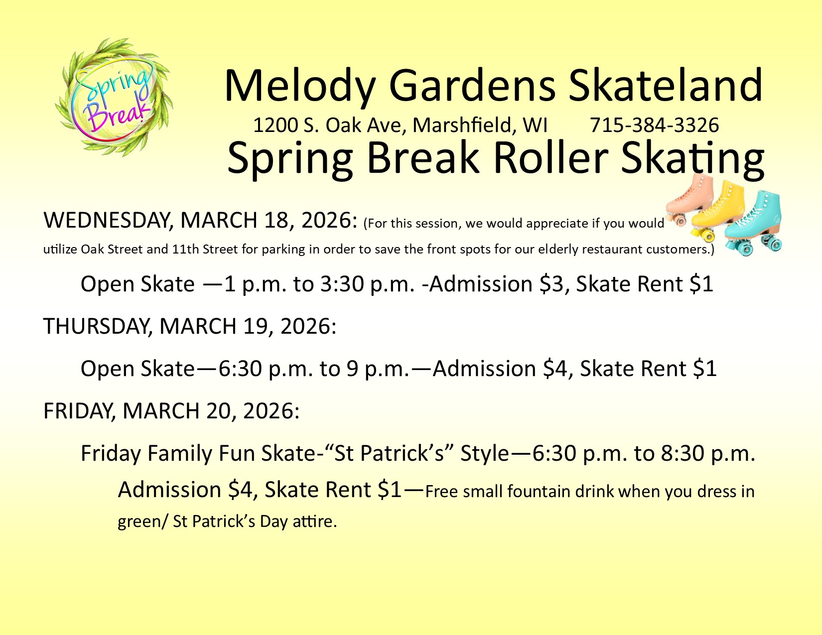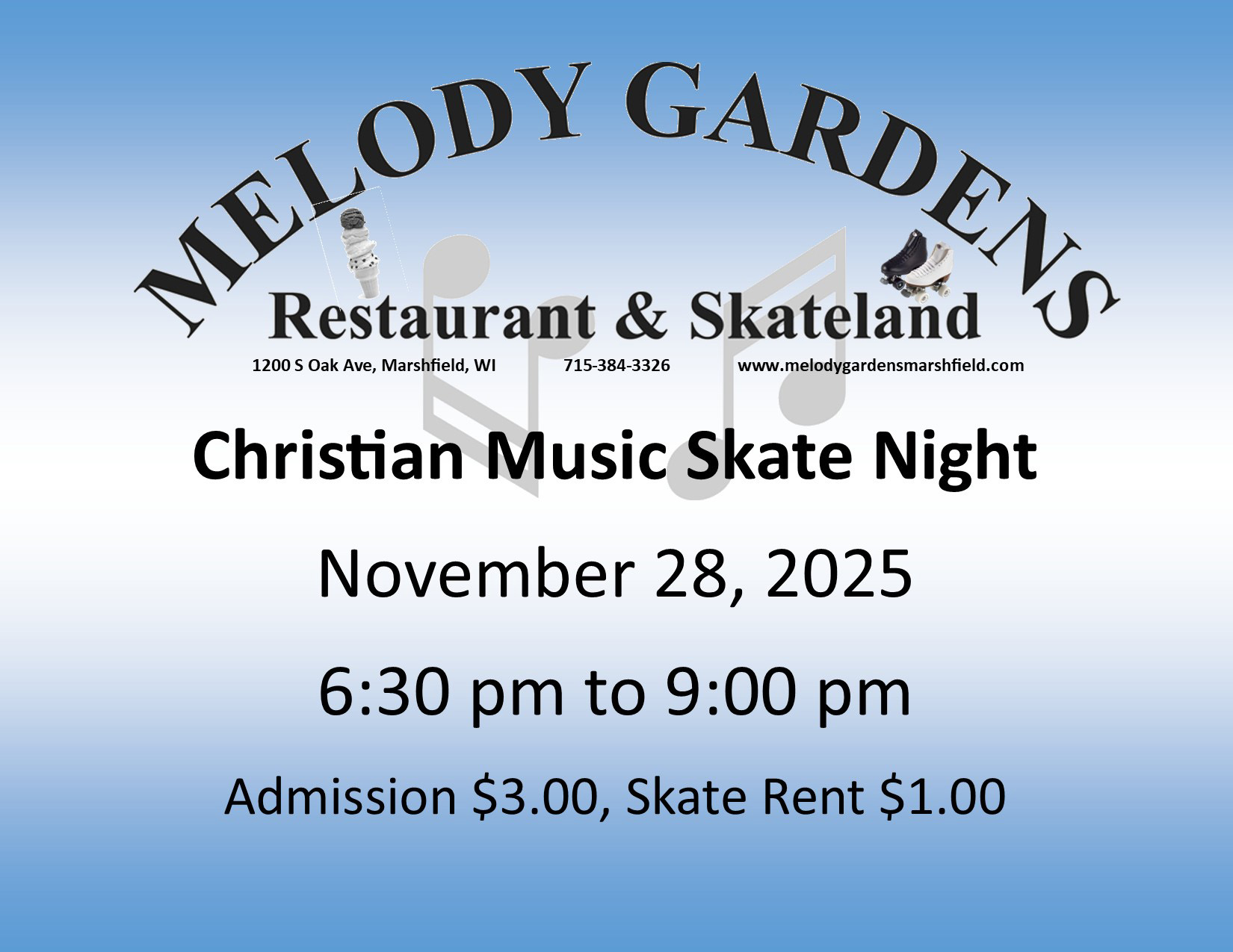 Melody Gardens Skateland Hours are listed on the Skateland Page.